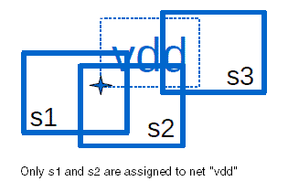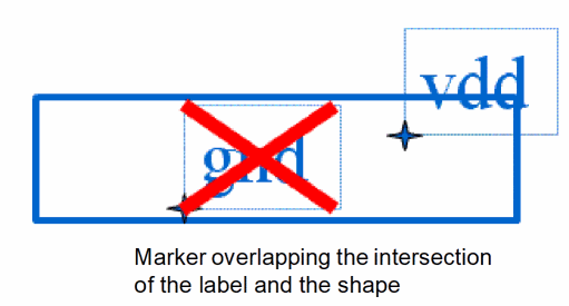 Scenario 1: If a label is overlapped by several shapes, only those shapes that overlap the origin of the label are connected to the net referenced by the label text.