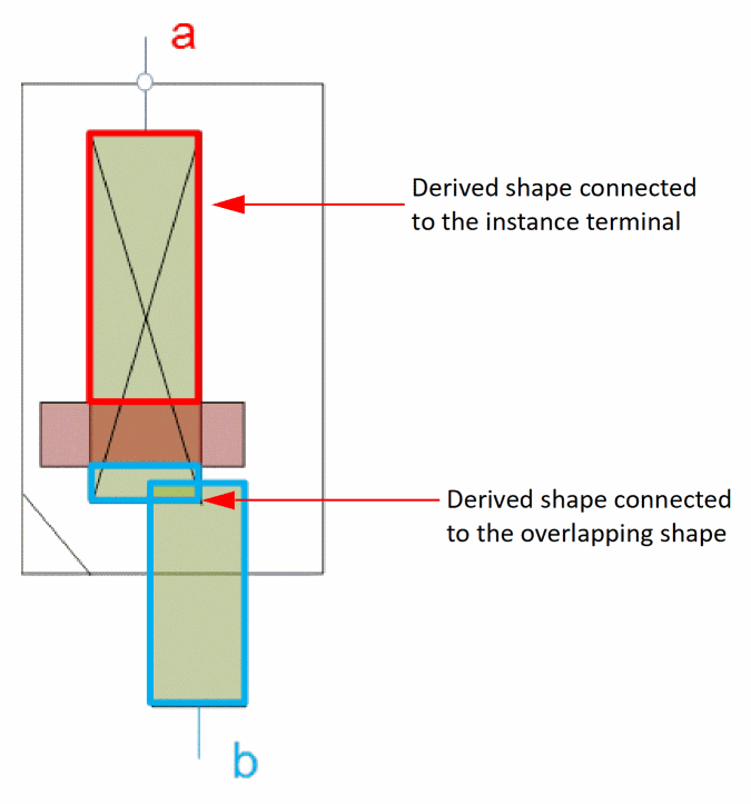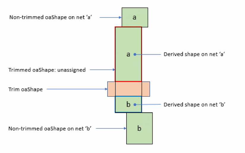 The figure below represents a shape trimmed into two parts by a trim shape. In this example, there are two derived shapes, one assigned to net a and the other assigned to net b. The trimmed shape is set as unassigned in the database.