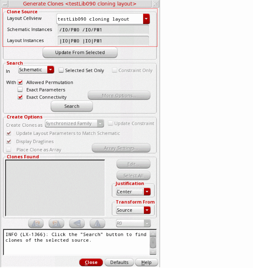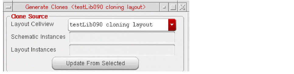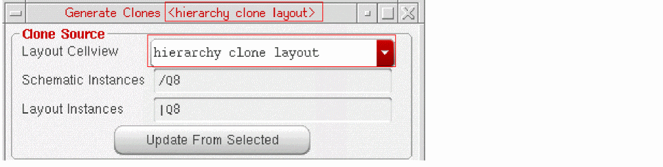 If the clone source is selected from the layout cellview in which the target clone needs to be generated, the name of the layout cellview as displayed in the Clone Source group box is the same as that of the current layout cellview. This is illustrated in the figure below.