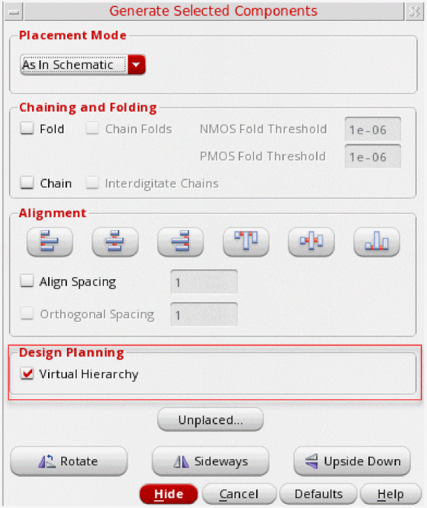 For more information on virtual hierarchies and the layout generation capabilities that are offered by Layout EXL or higher tier to work with virtual hierarchies, see the Virtuoso Design Planner User Guide.