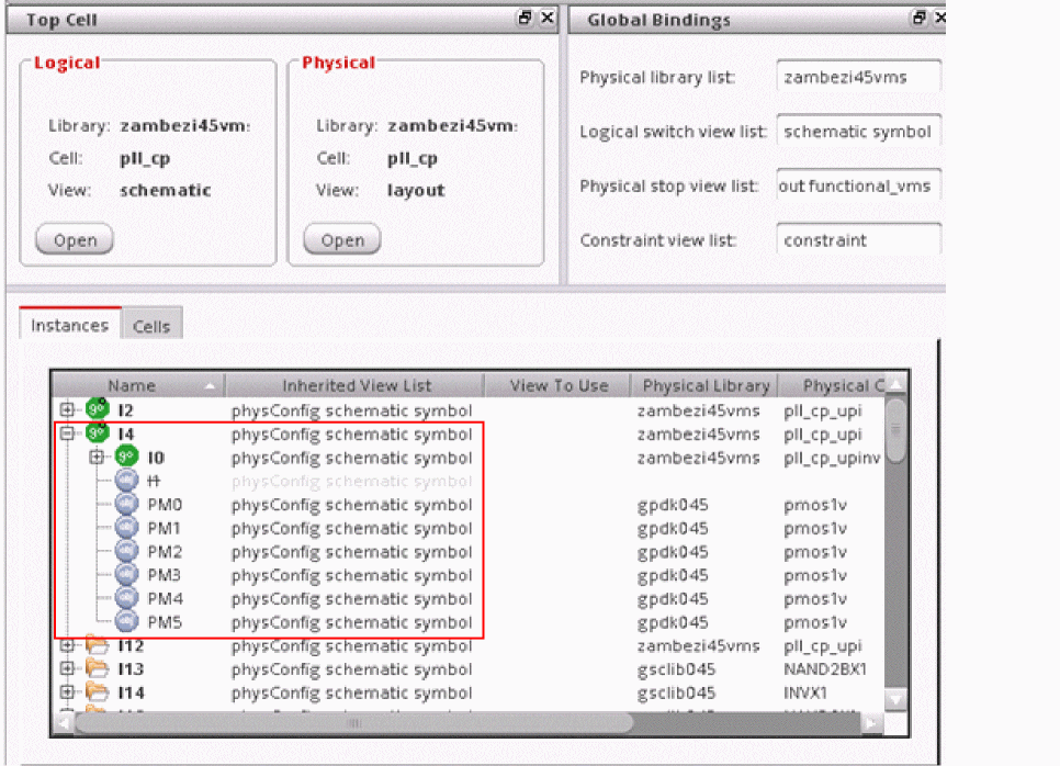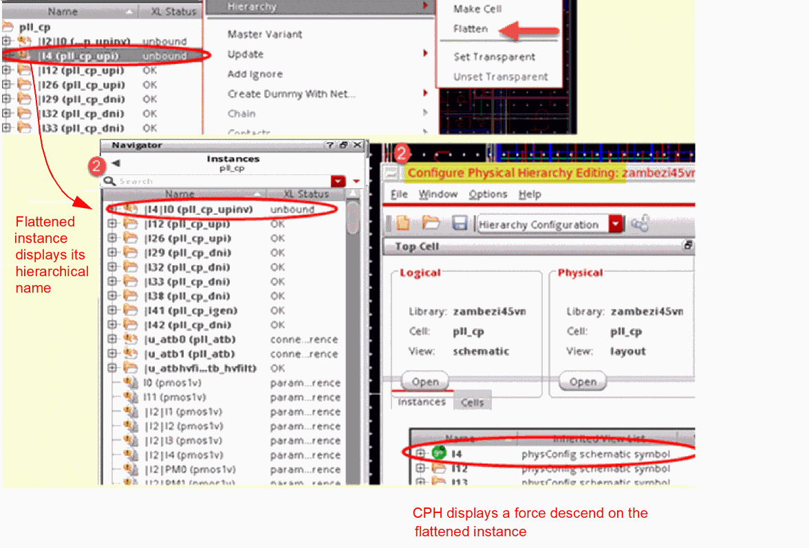 When a layout instance is flattened, a hierarchy mismatch is introduced. To resolve the mismatch and to maintain the correct binding and XL compliance, Layout XL automatically sets a force descend on the flattened instance in the physConfig view. This ensures that Layout XL can look inside the schematic instance and bind its contents to the corresponding layout instances that have been flattened and brought up to the top level.