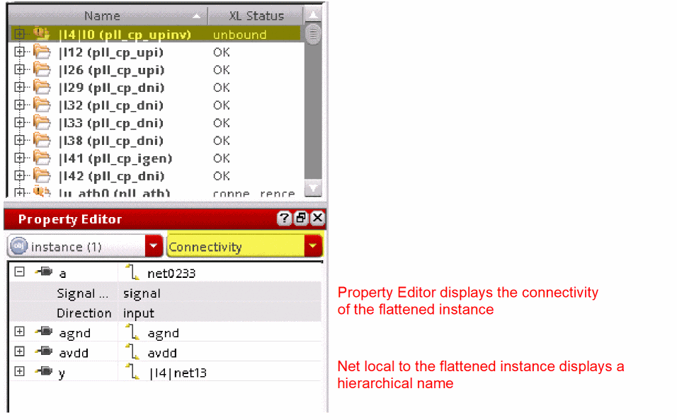 By default, the connectivity of the flattened instance is preserved and can be verified using the Property Editor. You can also probe the selected nets. The nets that are local to the flattened instance display a hierarchical name, as shown in the figure below.