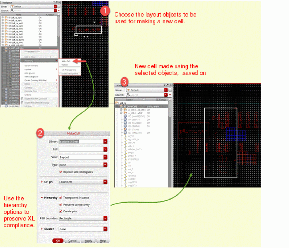 When used in Layout XL, the Edit – Hierarchy – Make Cell command enables you to create a new cellview carrying a transparent cell instance by using existing layout objects such as devices, nets, and pins. The made cell is saved on the disk and can be consumed within the layout from which it is generated or in some other layout.