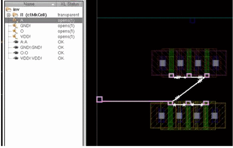 By creating pins for all the instance terminals, Layout XL gives you the flexibility to choose the instance terminal with which to connect. In addition, it gives you a clear picture of the opens from the top level, although it correctly reports only a single open. Therefore, when you route a pin A from the top level to one of the pins in the made cell, A, Layout XL marks the top level net, net A, as complete.