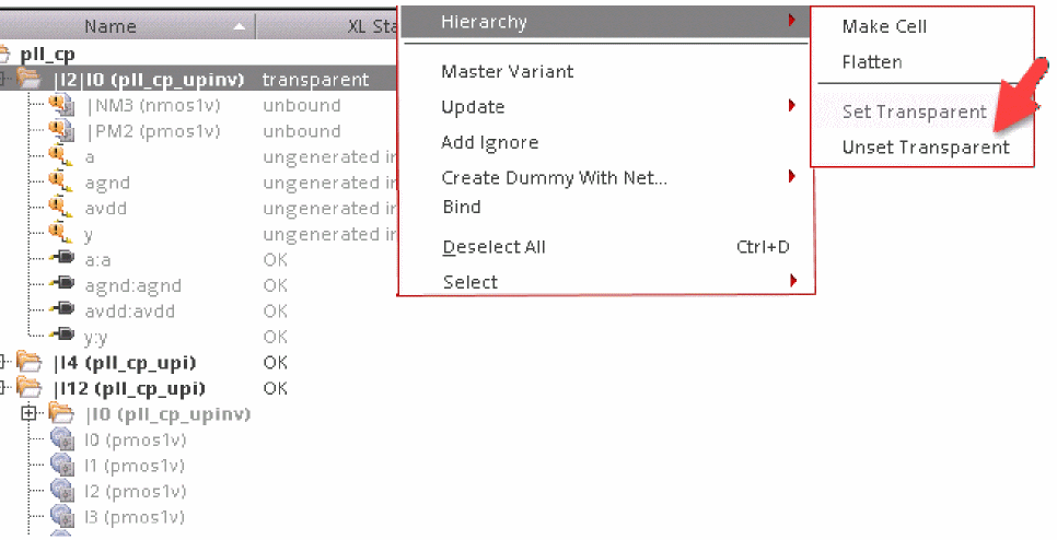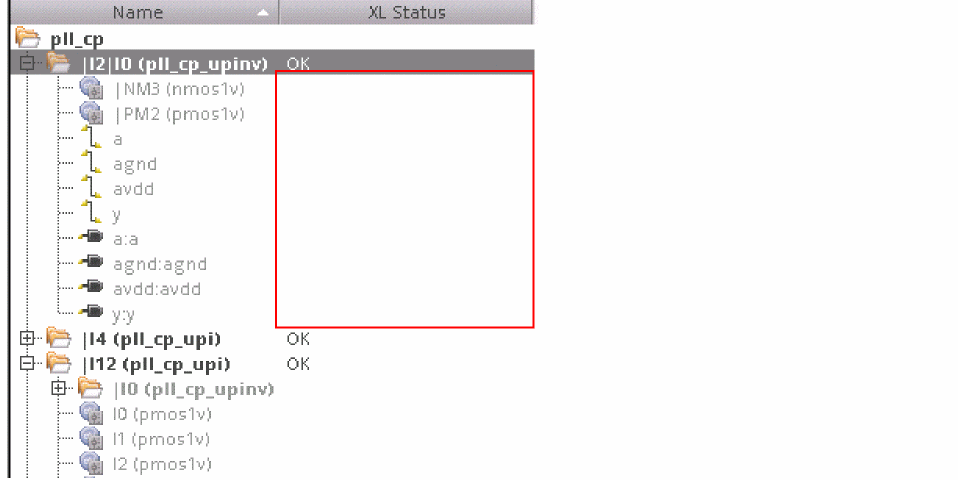 The instance is now set as non transparent and the XL Status changes from transparent to reflect the current binding status, as shown in the figure below. The instances and nets within the transparent instance are no longer visible to the binder, which means that the binding status of the instances and nets within is no longer displayed in the XL Status column, as displayed in the figure below.