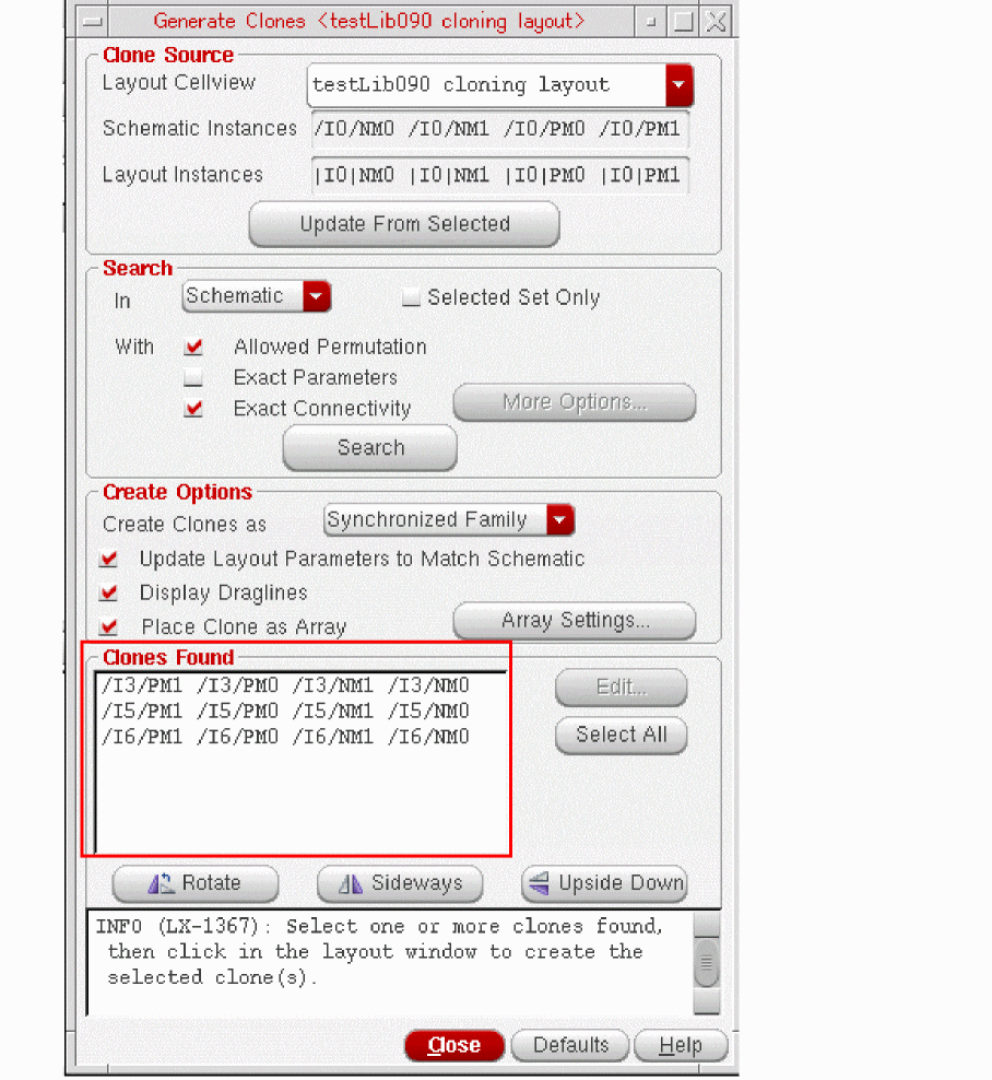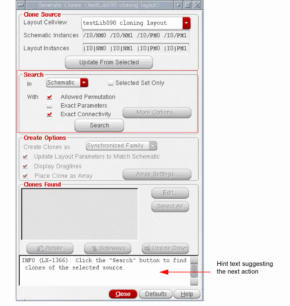 In the Search group box, choose whether to search for the target clone in the entire Schematic or Layout or within the Selected Set Only.