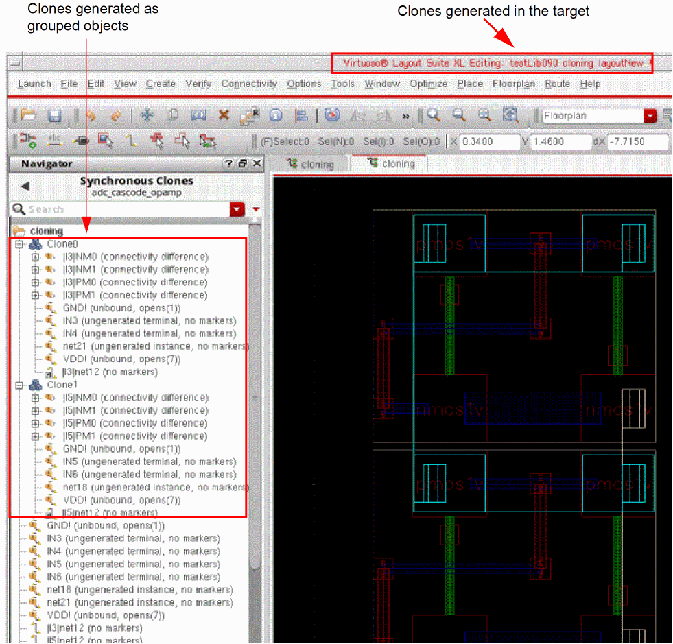 The target clones are generated in the target layout canvas as grouped objects and you can verify this by using the Navigator assistant, as shown in the figure below.