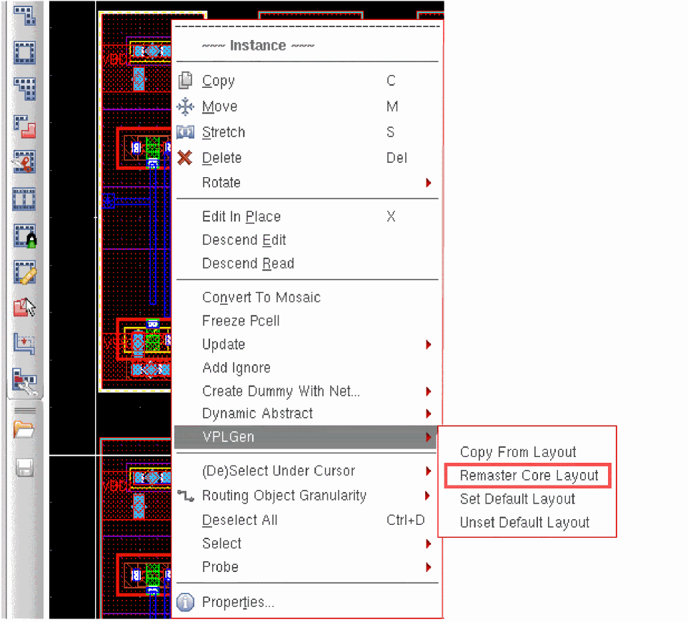 Right-click the VPLGen Pcell instance and select VPLGen – Remaster Core Layout.