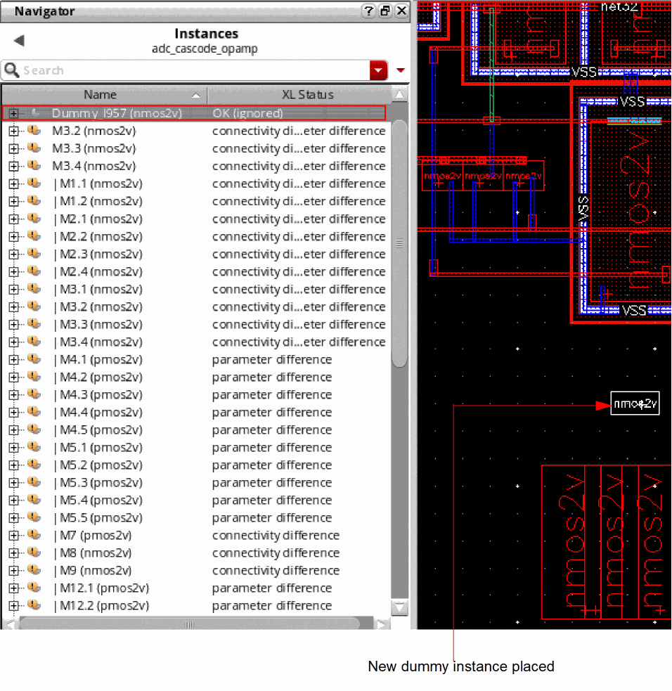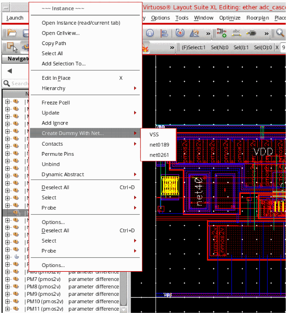 In the Layout XL canvas, right-click the selected instance (or multiple instances) for which you want to create a dummy and choose the Create Dummy with Net command. Then, select the net with which you want to associate your dummy. The list of nets contains power and ground nets and nets connected to the selected instances.
