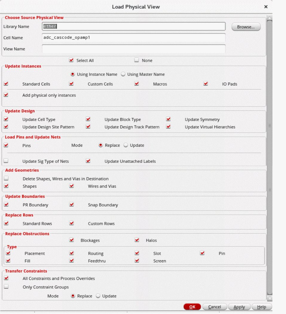 If you choose to load a particular category, all the objects in that category are updated. For example, if you choose to update Standard Cells, then all the standard cells in the source cellview are updated to the target cellview. To copy only some cells, open both cellviews and use the Copy and Paste commands instead. -
