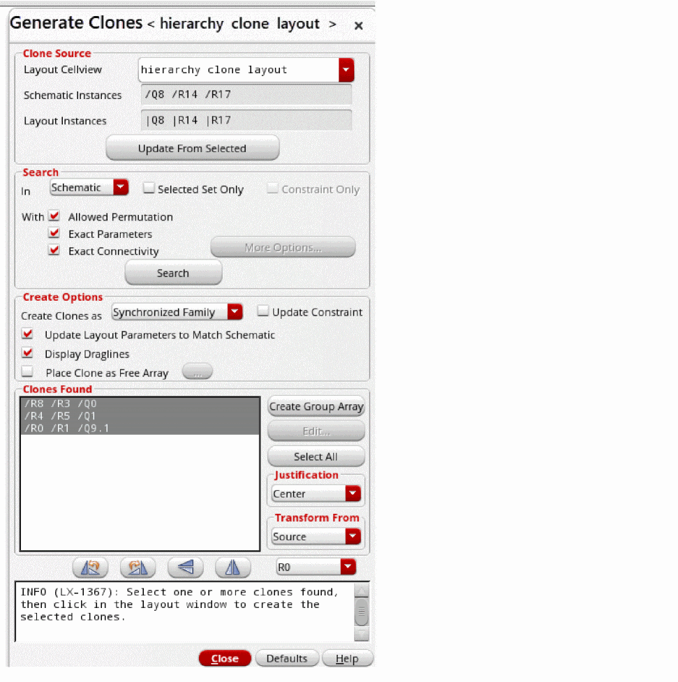 - In the layout canvas, select the individual component or components within an area that need to be cloned and choose the Connectivity – Generate – Clones command.