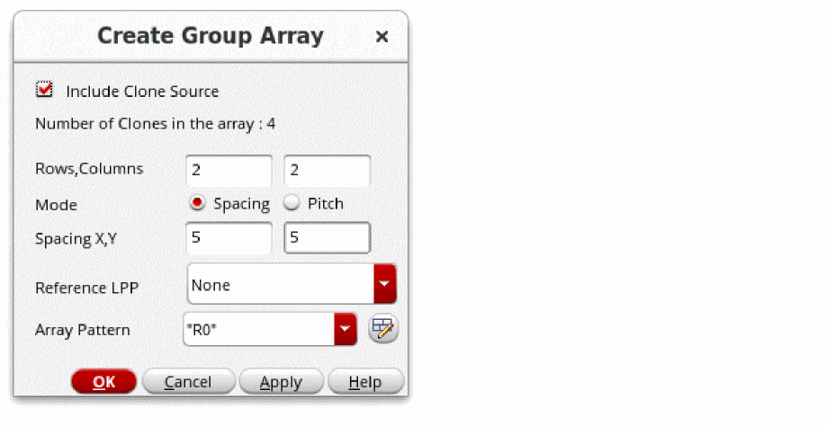 The group array is created automatically as a batch operation without any drag set. Each clone is a cell of the group array. The clone source is used as the lower-left cell of the group array and then other newly created clones are placed relatively to the existing clone source, respecting the group array settings such as spacing and number of rows and columns.