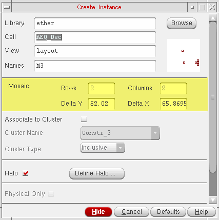 Select the layout instance in the canvas or the Navigator assistant and choose the command. - By generating a mosaic array in the layout view based on the instances selected in the schematic view.