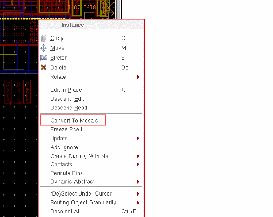 To display the Convert To Mosaic command in the Instance shortcut menu, right-click the instance in the layout canvas.