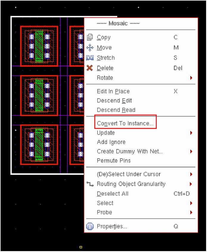 Irrespective of the method that you use for creating a mosaic instance, you can convert the mosaic instance back into a regular layout instance by using the Convert To Instance command. Any existing bindings and connectivity on the mosaic are retained during the conversion.