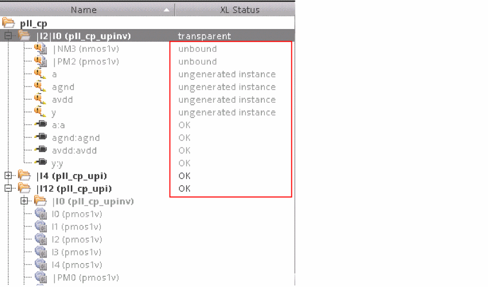 transparent, as displayed in the figure below. This implies that the instances within the transparent instance can now be recognized by the binder. The instances and nets within the transparent instance are not grayed out like before, which indicates that these are now visible to the binder. In addition, the XL status of the instances and nets within the transparent instance is now reflected.