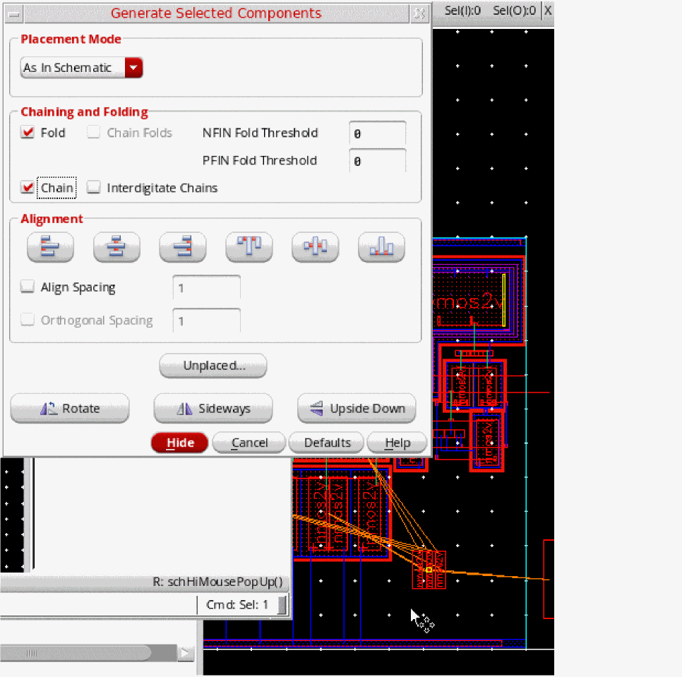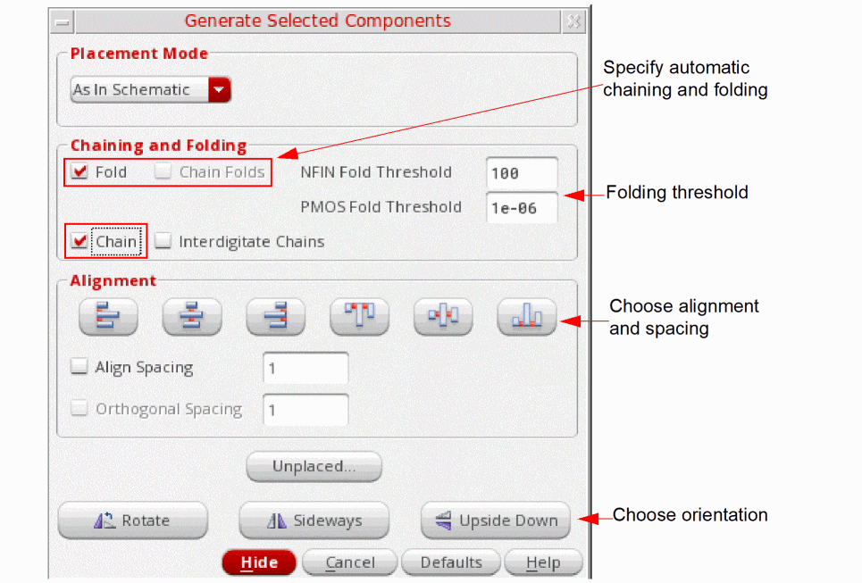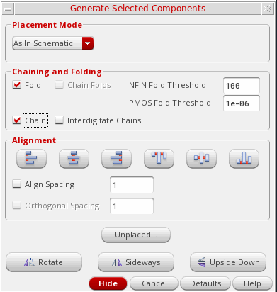 - (Optional) Use the Alignment options to automatically align and space the components as they are placed. For example, set Align Spacing to 2 to automatically space the selected instances by 2 user units when they are generated and then click Align Bottom to align the bottom edges.