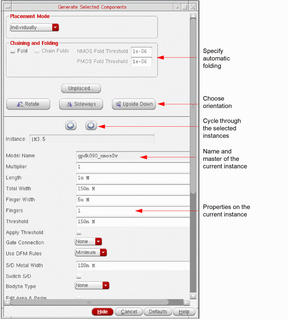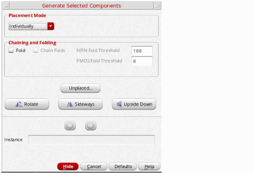 The selected instances remain highlighted until they are either deselected or generated in the layout view. You can select an instance in the schematic if it is not already bound to an instance in the layout. If there is an existing layout instance with a matching name which is not bound to the selected schematic instance, the name of the instance generated in layout is controlled by therenameConflictingLayoutInstancesenvironment variable.
