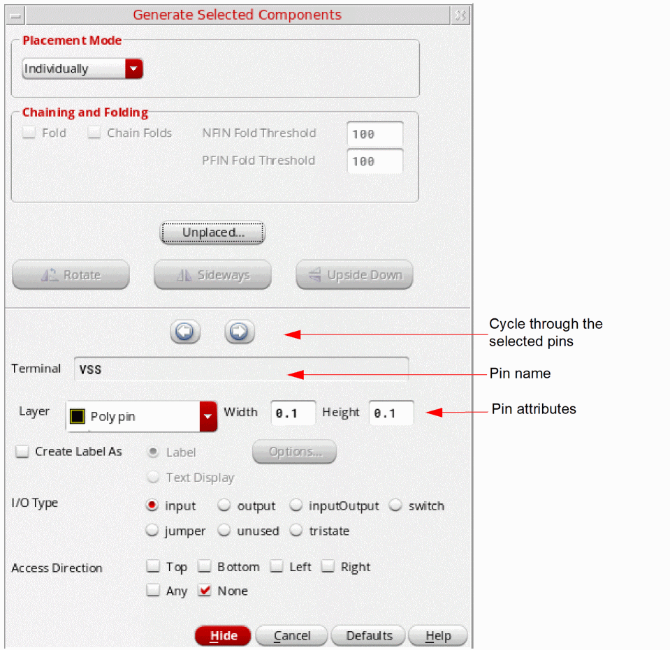 - Change the pin attributes if required. Any changes you make are applied to the current pin and also become the defaults for all subsequent pins in the selected set. For more information, see Generate Selected Components - Pin Options Form.