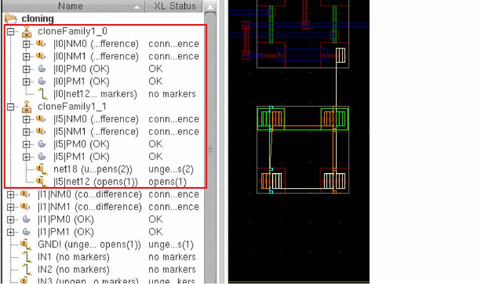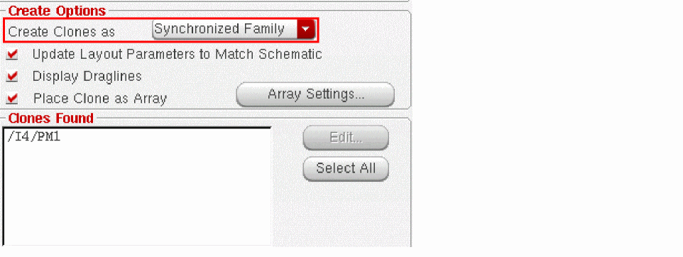 If the synchronous family you are creating contains only one group, Layout XL uses this existing group to implement the synchronous clone. This prevents the creation of an unnecessary level of hierarchy.