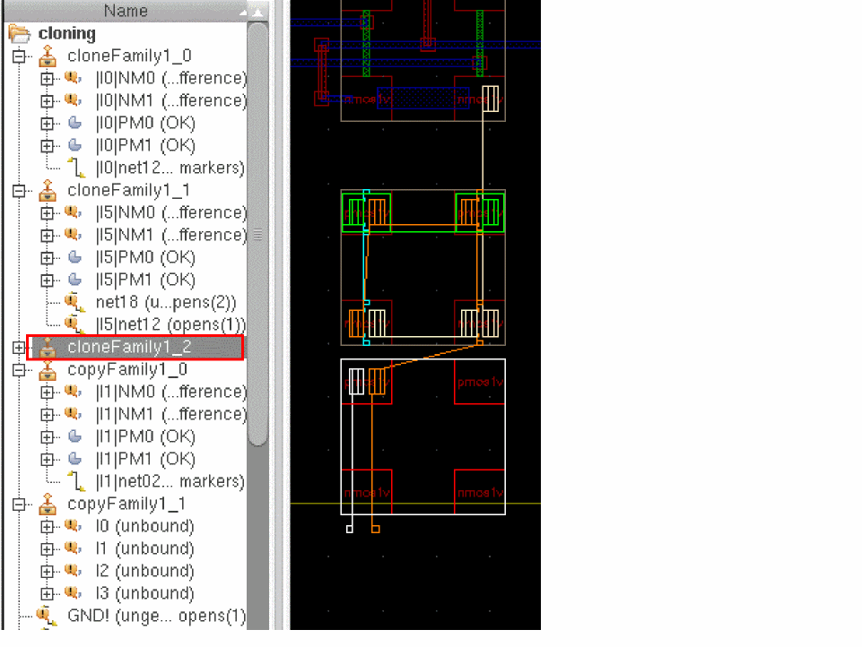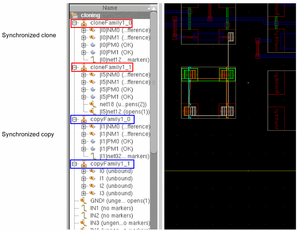 The clone source and the target clones are generated as two synchronized clone groups that can be identified in the Navigator assistant by their unique names, such ascloneFamily1_0andcloneFamily1_1in the figure below.