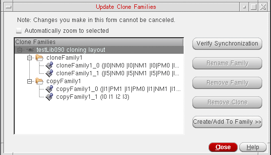 To verify whether the generated clone families are correctly synchronized, choose the Connectivity – Update – Clone Families command to display the Update Close Families form, as shown in the figure below. Select the clone family to check and click the Verify Synchronization button. To check synchronization for all the clone families, leave the clone families deselected and click Verify Synchronization,