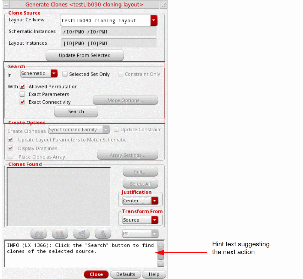 In the Search group box, choose to search the target clone in the schematic or layout canvas, as appropriate.