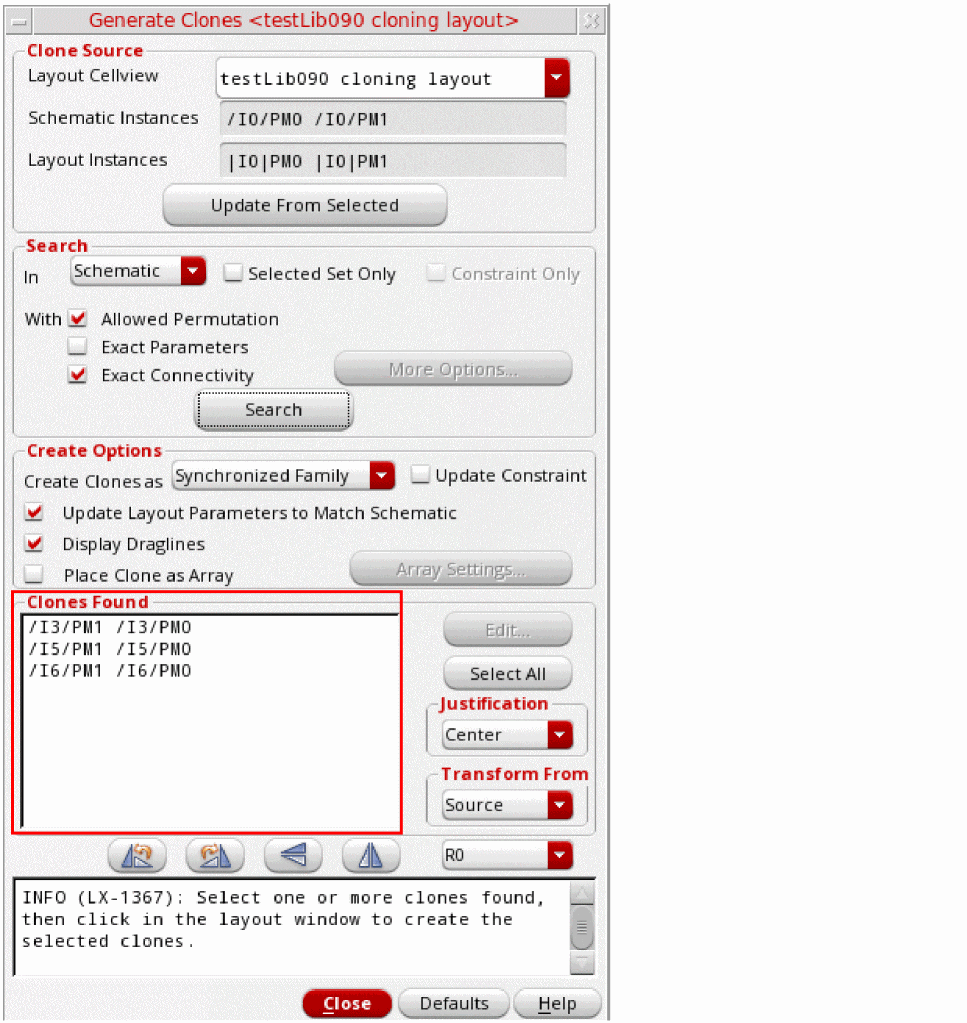 - If the search is run in the schematic and Selected Set Only is selected, the clone search ignores any devices that are not selected in the schematic or that are already implemented in the layout.