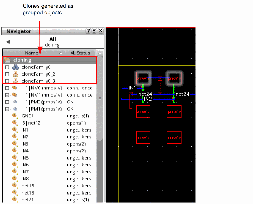 The target clones are generated in the layout canvas as grouped objects and you can verify this by using the Navigator assistant, as shown in the figure below.