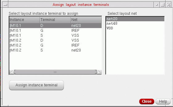 In the Assign layout instance terminals form, select a layout net from the list on the right and one or more instance terminals to which it is to be assigned from the list on the left.
