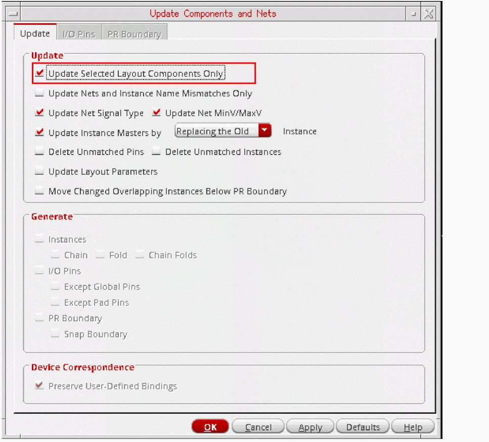 Preserve User-Defined Bindings is switched on and grayed out. - To update only the connectivity information for the selected instances and pins, select the Update Nets and Instance Name Mismatches Only check box and proceed to step 9. If any pins have got swapped due to a schematic ECO, run the Update with Update Nets and Instance Name Mismatches Only selected to ensure that the original pin positions are retained in the layout. To reflect the pin swaps in the layout, run the Update with Update Nets and Instance Name Mismatches Only deselected.
