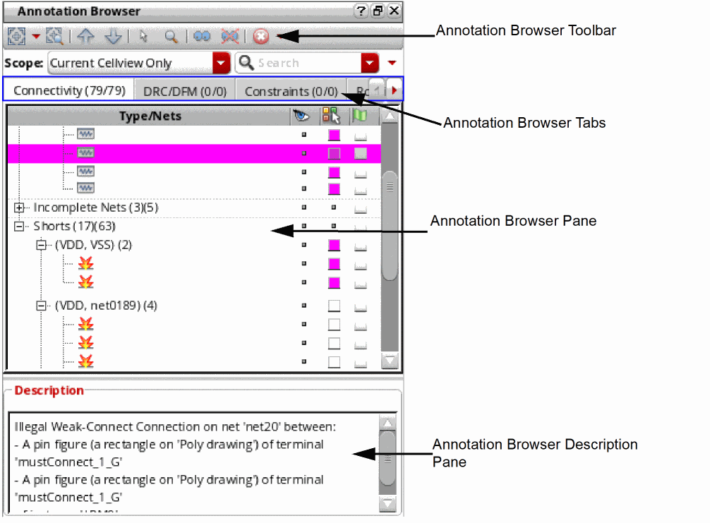 Use the Annotation Browser to view and manage the violation markers generated for the current design by different Virtuoso applications.