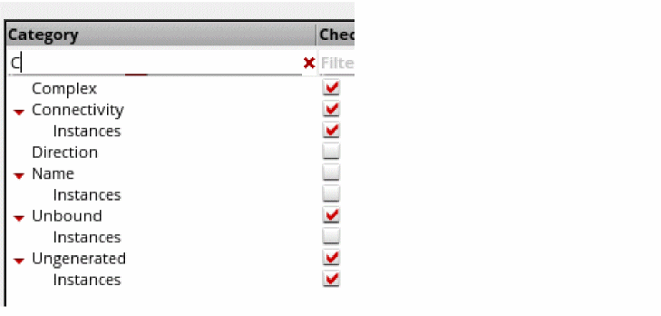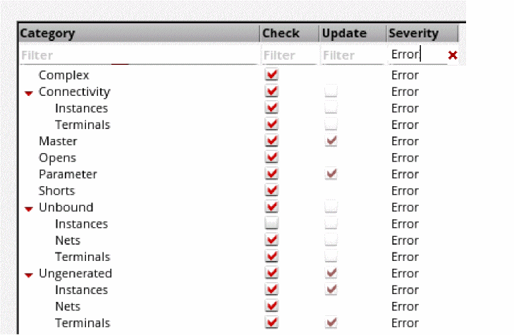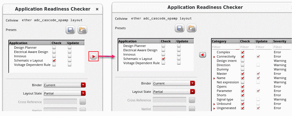 Specifies the focus areas of the design that need to be checked and updated for the selected application. Right-click in this column for the following options: The following checks can be run when Schematic v Layout is selected: