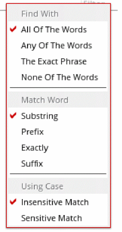 Specifies the criteria to filter the information for Category, Check, Update, and Severity columns. You can filter by typing in the text box of the respective column. You can use the right click shortcut menu to specify the criteria for filtering. For example, you can choose to filter All Of The Words, Any Of The Words, The Exact Phrase, or None Of The Words. The following image shows all the options available to specify the criteria for filtering. |
