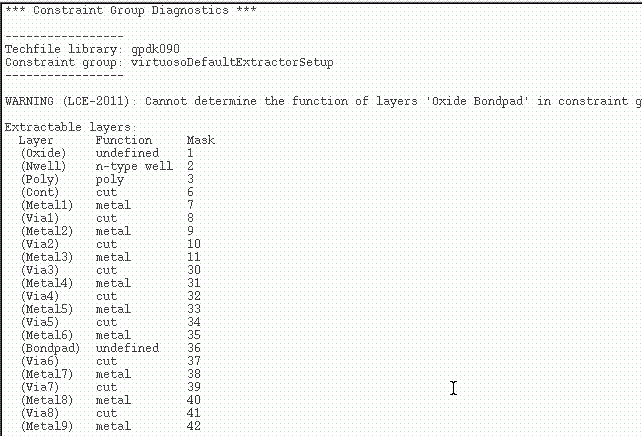 Diagnostics Report Displays extraction-related information about the selected constraint group and appropriate warning messages to indicate if the technology file has been correctly set up for extraction. You can display the report in a separate information window or in the CIW (see Extractor Diagnostics Options Form for more information).