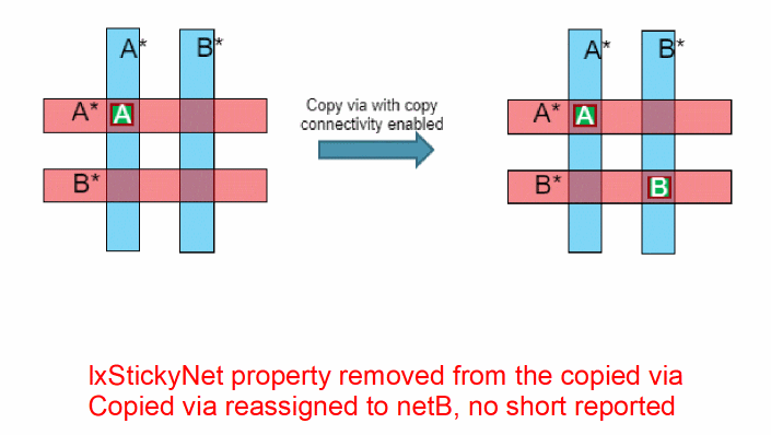 Ensures that shapes that are connected to a connectivity source, such as a pin, an instance terminal, or a label, automatically have their lxStickyNet Property property removed to avoid any shorts or illegal must connections. By default, the option is OFF.