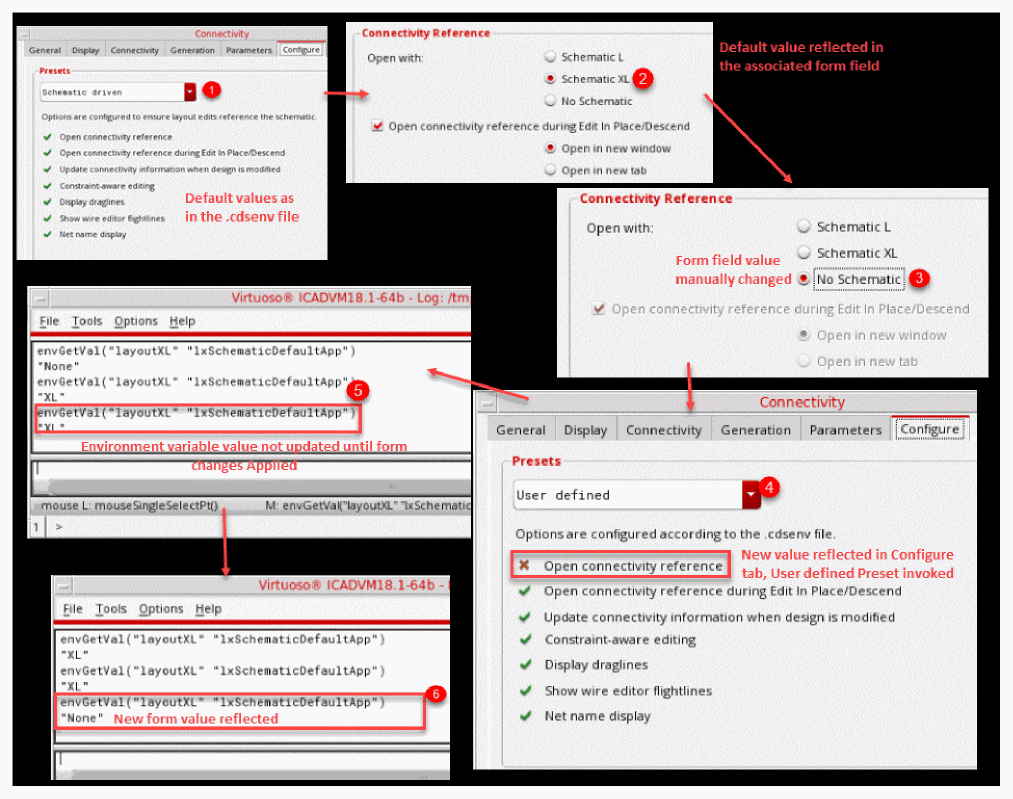 Reflects that the form fields associated with the Preset options are neither Schematic driven (all fields set to ON) nor Non schematic driven (all fields set to OFF). If the Connectivity form is already open, the Configure tab is switched to User defined Preset mode. The associated environment variable is also set to the new form field value, after the form field value is applied. If the Connectivity form is opened again in the same Virtuoso session, it opens the Configure tab in User defined Preset mode, using the new form field value. |
