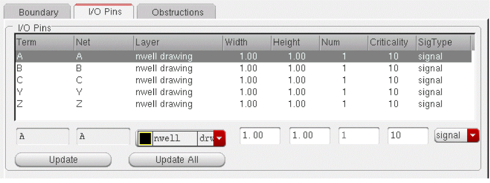 This table is initialized with Term and Net names from the symbol view of the selected soft block.