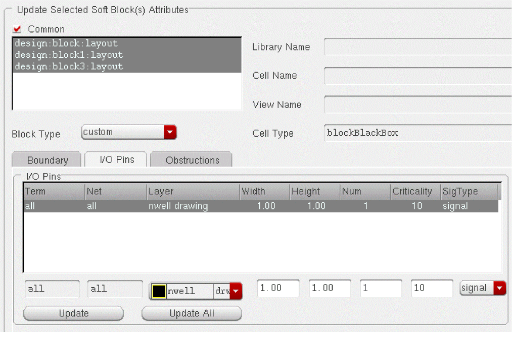 Use the Edit Soft Blocks form to modify the type of soft block that will be created; the shape and size of the PR boundary; the shape, size, and signal type of soft pins; and the routing and placement obstructions inside the block.