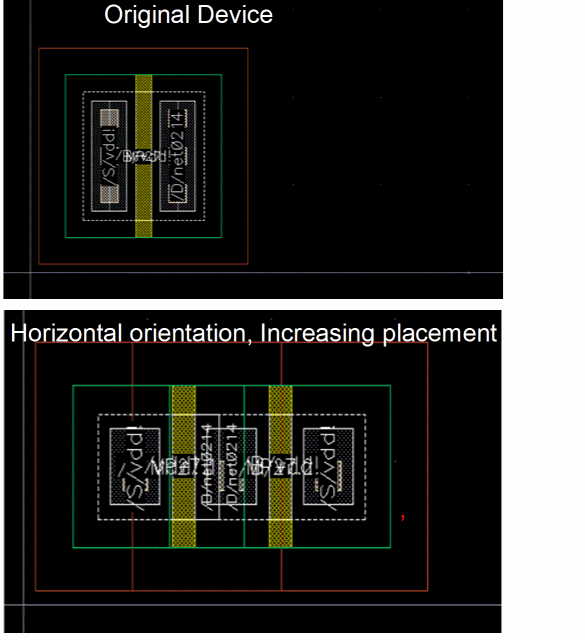 Generate Folded Devices form also enables dividing an individual FinFET device or a chain of devices into two or more folds. Folding lets you change the aspect ratios of the devices in your design while retaining the original orientation. The devices to be folded need not be bound to a schematic instance. If the disableFolding environment variable is set and the folding threshold for the component type is set to 0, folding is disabled.