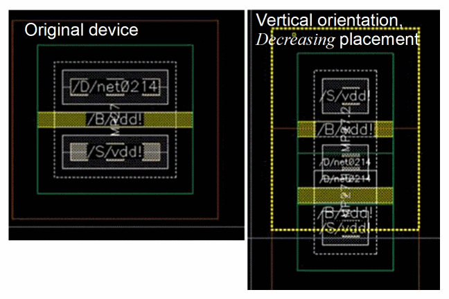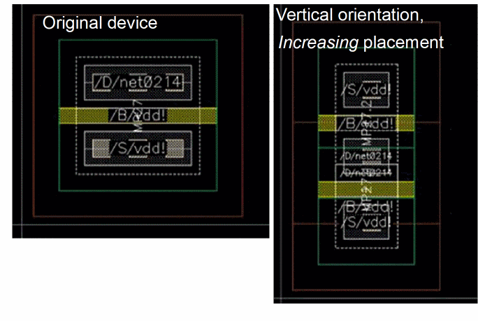 Creates the device folds at the same location in the layout canvas as the original device in a row region when at least one of the selected instances is on a row region. If the original instance is at an orientation, such as R90, that can place the folds vertically, the Create In Place option can be used to create the new folds above or below the original instance. Choose between Increasing or Decreasing to specify how the new folds are positioned. The positioning of the folds also varies depending on the placement orientation - horizontal or vertical. |