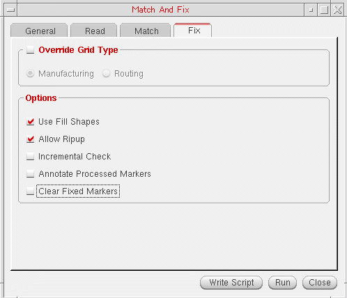 Performs automatic fixing of the matched layout patterns and enables modification of the options on the Fix tab.