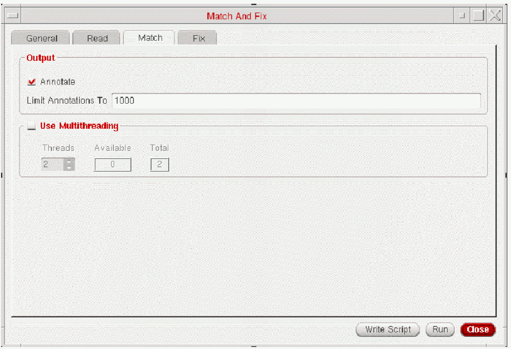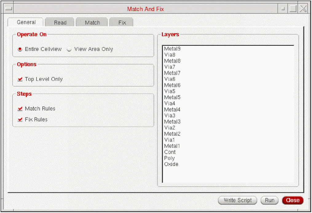 Use the General tab to define the scope of the options to be used for matching and fixing the layout patterns. The following table describes the fields available on the General tab of the Match and Fix form.