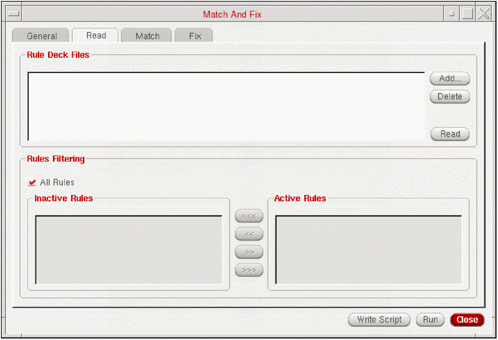 Use the Read tab to set one or more rule deck files and specify the active rules to be applied to match and fix the layout pattern.