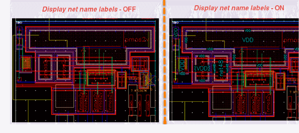 Displays the net names on top of all the shapes, which can help make the labels more visible. The labels are displayed on top of the shapes after the design is first fully drawn. This ensures that the labels are actually drawn on top of the shapes, making them more prominent.