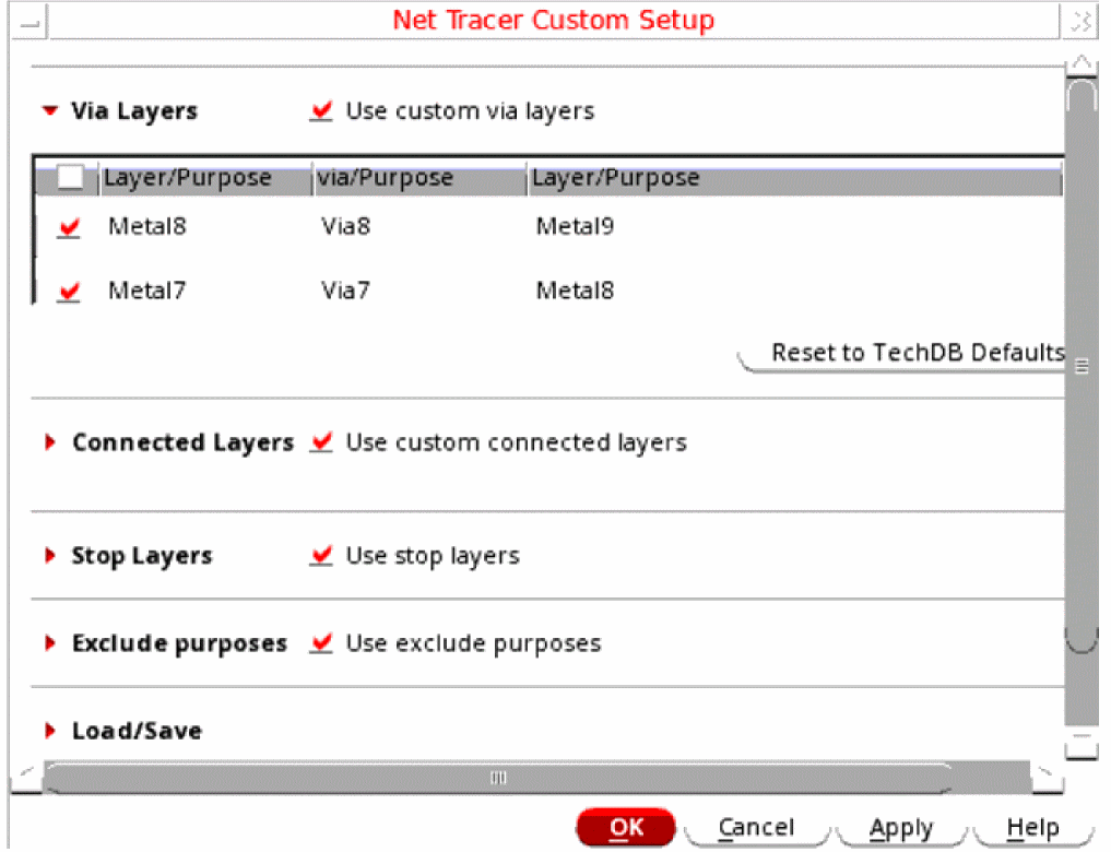 Lets you specify the via layers to be used for tracing. When this option is selected, the layer1-via-layer2 lists displayed in the table below are enabled. The table lists all the via layers from the technology file and any via layers that you have added. Select the check boxes associated with the individual via layers that you want to use for tracing.