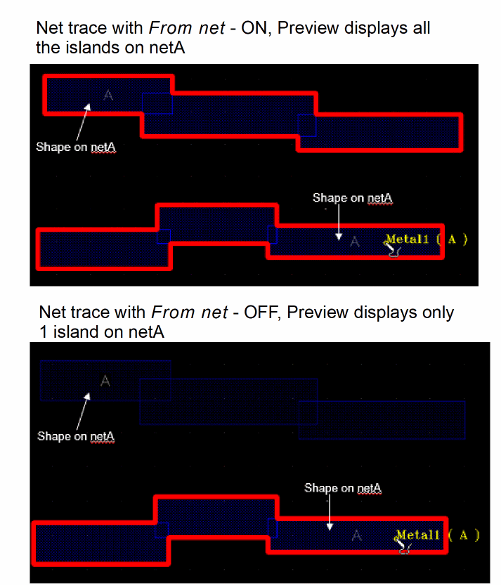 Lets you add traces to highlight all the shapes that are physically connected on the same net. Even with From net selected, the Net Tracer may not highlight all the islands on a net, if the traced shape does not contain the required net information. Before you click the shape to generate the trace, move the cursor over the shape to see if the information balloon displays both the layer name and the net name. If only the layer name is displayed, the shape in question may not have the net information available. So, tracing will be performed assuming From net is deselected. If both Step mode and From net are selected, Step mode is set as the preferred tracing mode. Environment variable: netTracerFromNet |