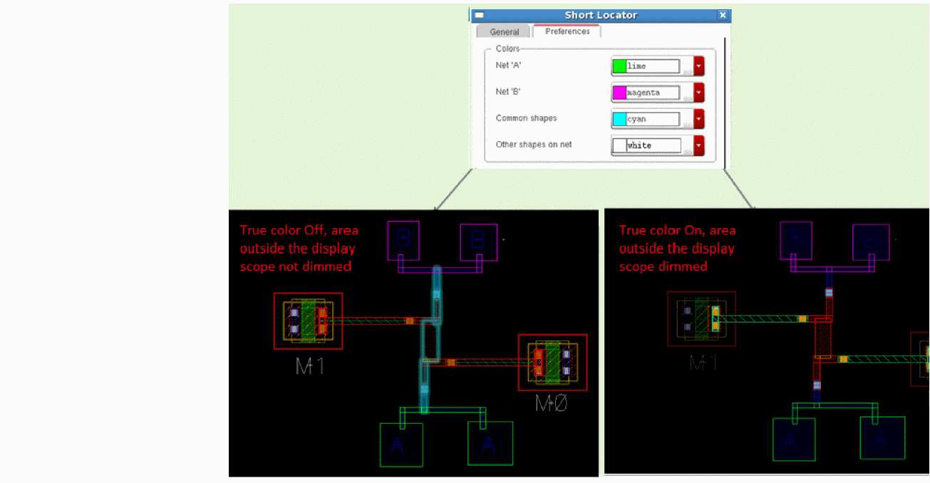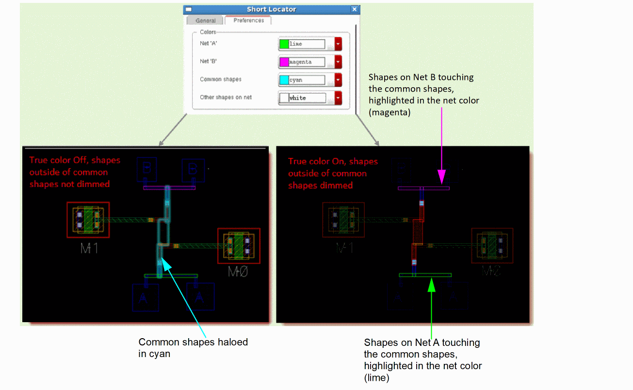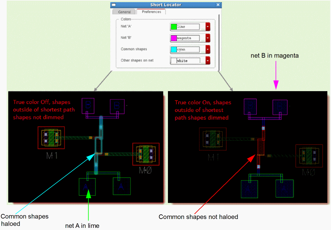 Common shapes haloed in the color selected for common shapes. Shapes on the shortest paths highlighted in the color selected for the corresponding shorted net. Other shapes on the net highlighted in the color selected for other shapes. If True color is selected, all shapes on the net are displayed in their true color and shapes not on the net are dimmed, as illustrated in the figure below. |