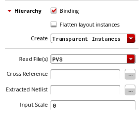 Specifies that the binder performs an automatic hierarchy match and creates complex bindings to improve the schematic versus layout bindings. Environment variables: bindFile, bindCrossRefFile, and bindExtractedNetlistFile If all the environment variables are set to "", Read File sets to None. If bindFile is set to a valid value, and the environment variable takes precedence over the other associated environment variables, Read File sets to Binding. Else, if bindCrossRefFile or bindExtractedNetlistFile are set, Read File sets to PVS. |