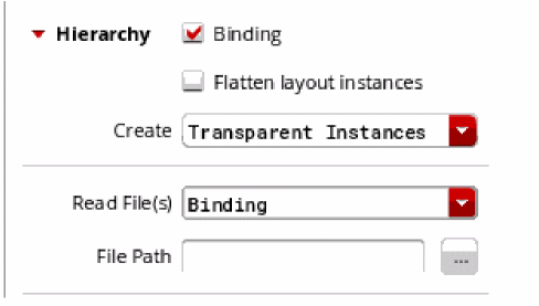 Generates transparent instances or complex bindings during hierarchical binding when Flatten layout instances is OFF. Alternatively, the Create option can create a synchronized family, a figure group, or let the flattened instances to exist as free objects, when Flatten layout instances is ON. By default, transparent instances are created when binding hierarchically. The options that you see in the Create field depend on the value of the Flatten layout instances option. If Flatten layout instances is OFF, Create displays the following options: Transparent Instances and Complex Bindings. The default is to create transparent instances. If Flatten layout instances is ON, Create displays the following options: Synchronized Family, Grouped Objects, and Free Objects. The default is to create Synchronized Family. Environment variable: bindFlattenLayoutCreate |